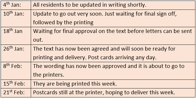 18th July 2022: Martin and Lilian talked to the council again about their lack of communication. We were told that the consultation would be in the Autumn.