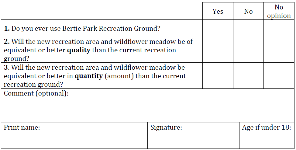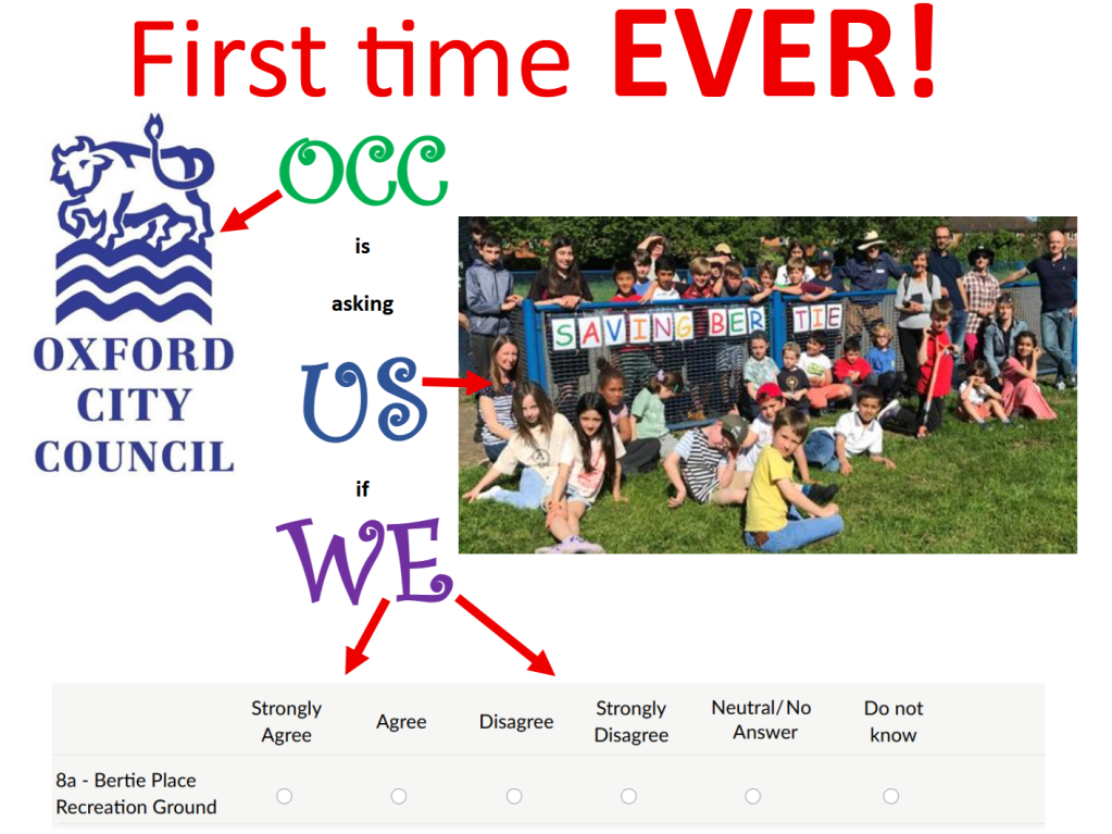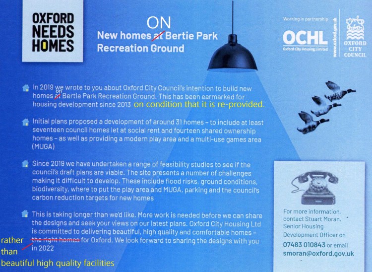 1st November 2022: The Bertie Park consultation will be held at the South Oxford Community Centre, Lake Street from 3.45 – 8.00 p.m. Here is the leaflet which was delivered. It does not mention that it is a consultation, or that they want to hear what people think! The Save Bertie petition hits 1,000 signatures. Here are the consultation materials. Here are comments posted on the “your comments” board during the Drop-in consultation. Here is the BBC report on the consultation. Government guidance states that “Existing open space, … recreational buildings and land … should not be built on unless … the loss resulting from the proposed development would be replaced by equivalent or better provision in terms of quantity and quality in a suitable location”. This table summarises what we have now and what will replace it.